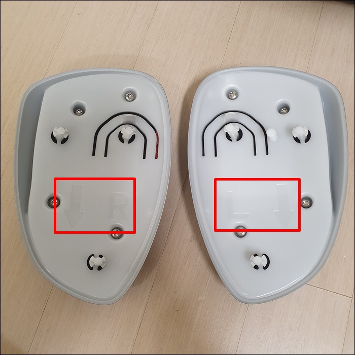 카시트 좌우 어깨 쪽에 보호대를 결합해야 합니다. 보호대 안쪽을 잘 보면 R/L로 좌우 구분이 되어 있기 때문에 방향에 맞게 조립을 하면 됩니다. 그리고 화살표를 아래 방향으로 표시해두었는데 이건 조립을 하는 방향을 의미합니다. 보호대를 카시트에 끼운 다음에 아래로 힘을 가해서 내려주면 '딸깍' 소리와 함께 조립이 완료됩니다.