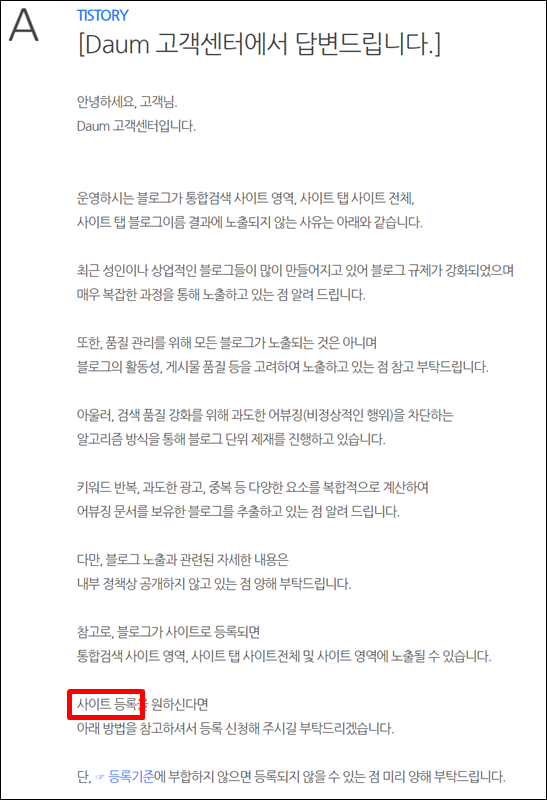 그래서 두 번째 방법인 사이트 등록을 재요청하게 되었습니다. 이 방법은 고객센터 답변에 있던 내용으로 고객센터 답변에서 알려준 방법으로 재신청을 하였습니다.