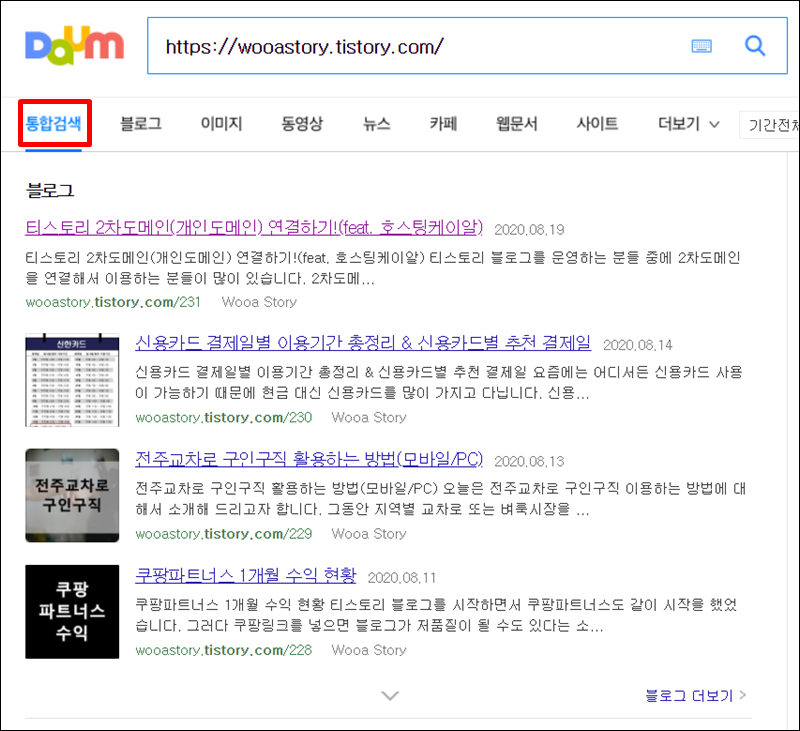 다음 포털에서 내 블로그 주소로 검색을 해보면 바로 확인이 가능합니다.