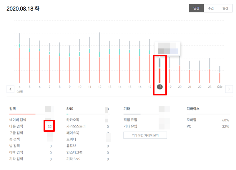 제가 저품질을 의심하게 되었던 날이 8월 18일이었습니다. 8월 18일에 방문자수가 크게 감소함을 보았고 유입경로를 살펴보니 다음에서의 유입이 대폭 하락이 되었습니다.