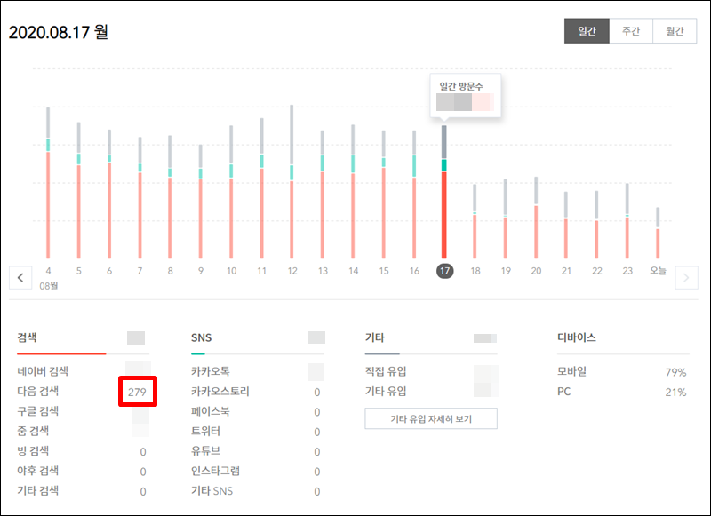아래 8월 17일과 8월 18일 다음 유입량을 보면 8월 17일에는 279명이 방문했는데 8월 18일에는 32명으로 확 줄었습니다.