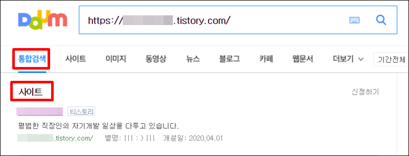 티스토리의 경우, 블로그를 개설하고 30~45일이 지나면 자동으로 다음포털 최적화가 됩니다. 그래서 블로그 초기 개설 시에는 블로그 주소로 검색해도 검색 결과가 나타나지 않지만, 30~45일 후 다음포털 최적화가 된 후에 검색하면 내 블로그가 정상적으로 검색되는 것을 확인할 수 있습니다. 아래 그림처럼 통합검색 사이트탭에 블로그가 정상적으로 검색된다면 다음포털 최적화가 되어 있는 상태입니다.